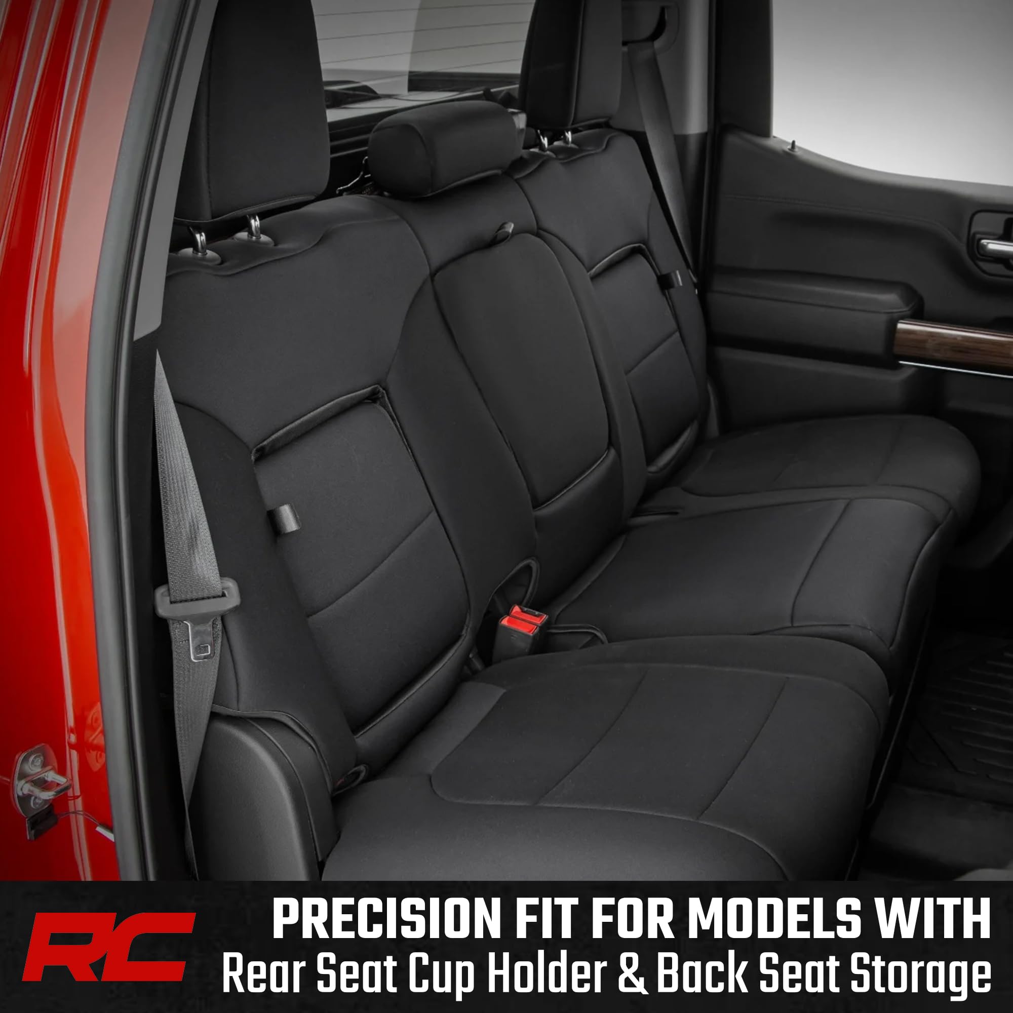 Rough Country Neoprene Seat Covers for Chevy Silverado & GMC Sierra 1500 (2019-2026) w/Rear Seat Storage & Cup Holder - Waterproof & UV Resistant, Foam Padded, Front & Rear Row Cover Set